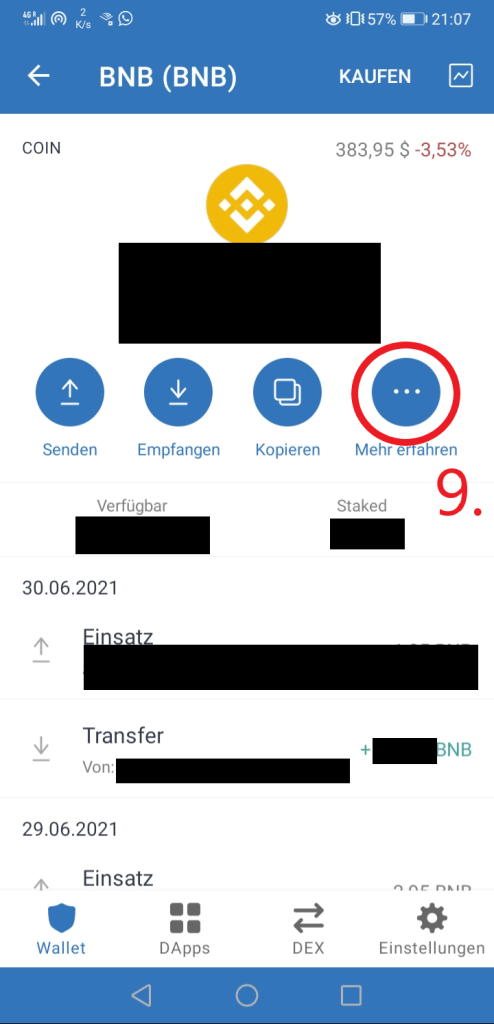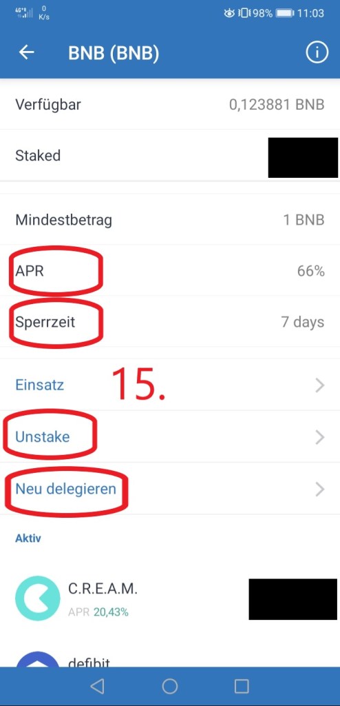 14. Um deinen Stakinginformation aufzurufen, klickst du auf der Startseite der Trust Wallet App auf „BNB“, dann auf „Mehr erfahren“ und danach auf „Stake Details“.