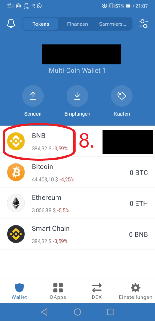 8. Öffne deine Trust Wallet und klicke auf „BNB“