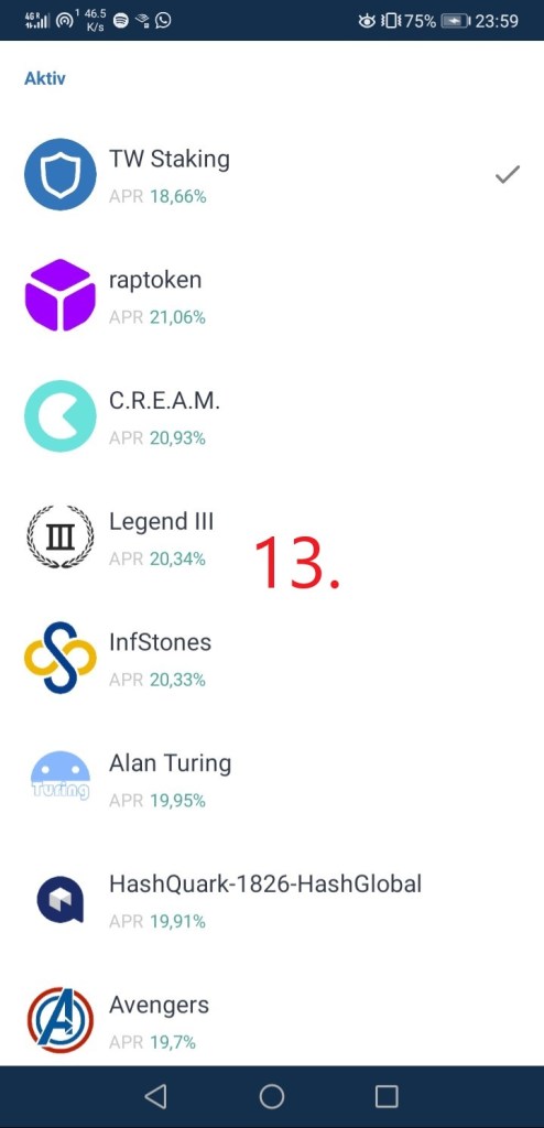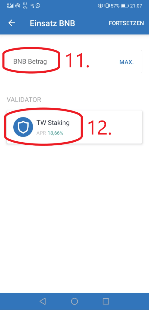 Entweder nimmst du den voreingestellten Validator von Trust Wallet selbst (TW Staking) oder suchst dir selber einen aus.