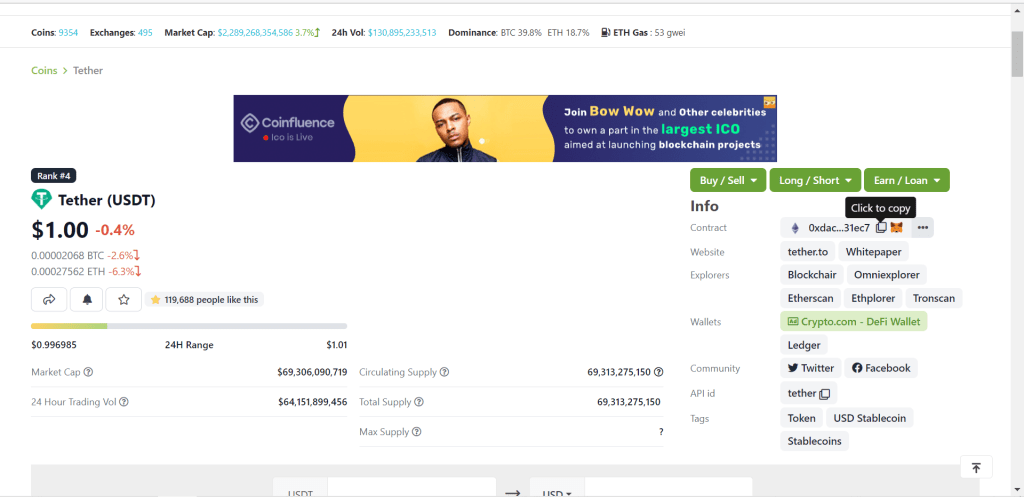 Gehe auf Coingecko oder auf Coinmarketcap und suche nach USDT